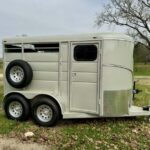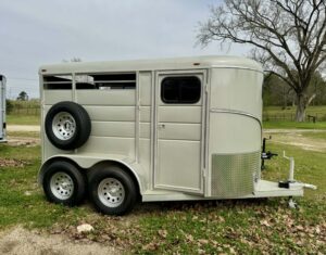 Calico 2 horse slant load trailer, 6′ wide x 6’6″ tall x 12′ long, 3500# axles, swing wall dressing room, 16-inch 10-ply tires, 24″ gravel guard, window in dressing room door, dome lights in dressing area and horse area, V-chrome on the front, 2 saddle racks, torflex axles, rubber on walls, mats, spare.
