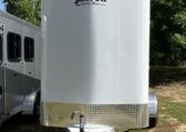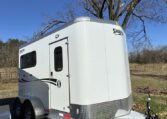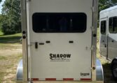 Shadow 2 horse slant load bumper pull with escape door and graphics, 13’6 x 6’9 x 7’6, 3500# spring leaf axles, 15″ tires, spare. Dressing room: 24″ short wall, 28″ dressing room door w 14 x 24 window, swinging slant wall, 2 saddle racks, bridle hooks, dome light. Horse area: 38″ escape door, 24 x 32 drop feed windows streetside, 42″ stall width, drop feed window curbside and rear door, dome lights, pressure treated wood floor with rubber mats, hinged rear door, exterior load light, 2 fans, exterior ties.