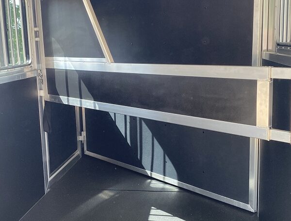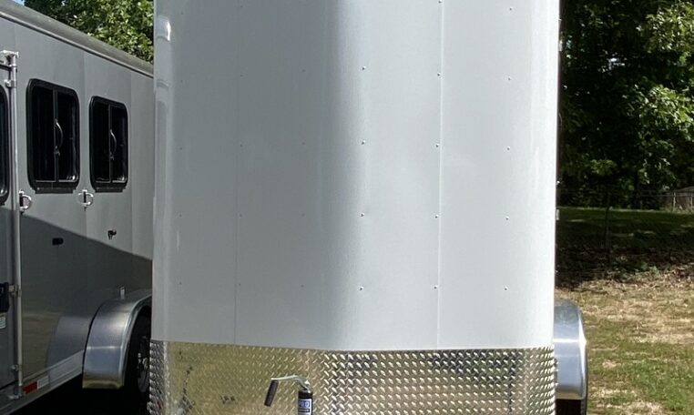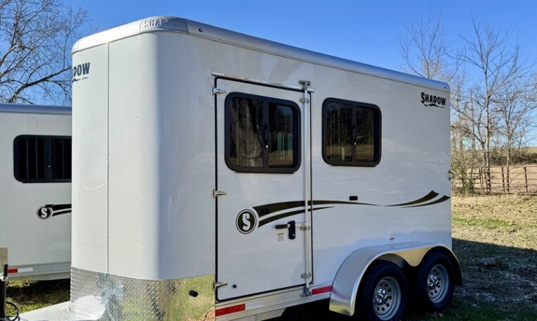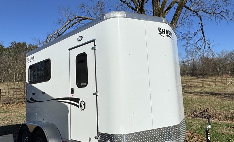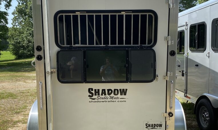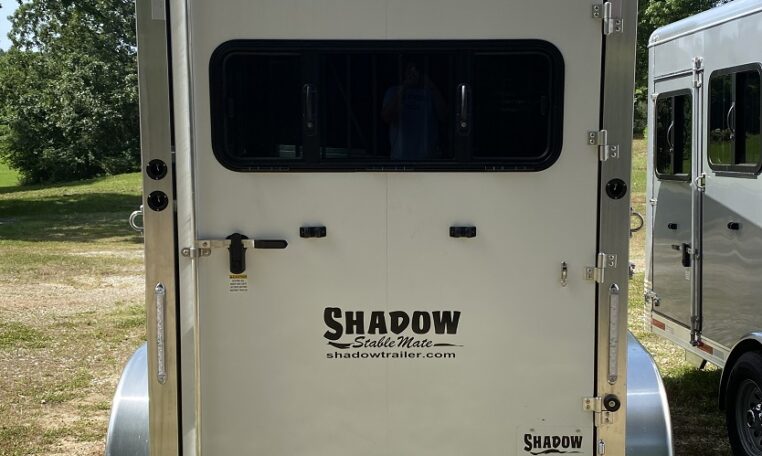 Shadow 2 horse slant load bumper pull with escape door and graphics, 13’6 x 6’9 x 7’6, 3500# spring leaf axles, 15″ tires, spare. Dressing room: 24″ short wall, 28″ dressing room door w 14 x 24 window, swinging slant wall, 2 saddle racks, bridle hooks, dome light. Horse area: 38″ escape door, 24 x 32 drop feed windows streetside, 42″ stall width, drop feed window curbside and rear door, dome lights, pressure treated wood floor with rubber mats, hinged rear door, exterior load light, 2 fans, exterior ties.