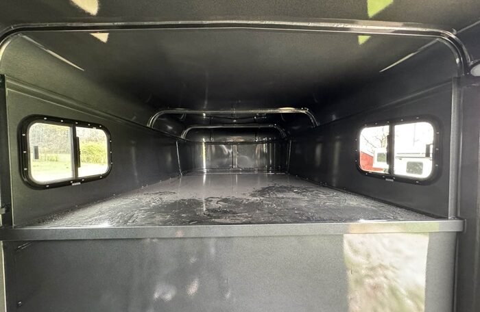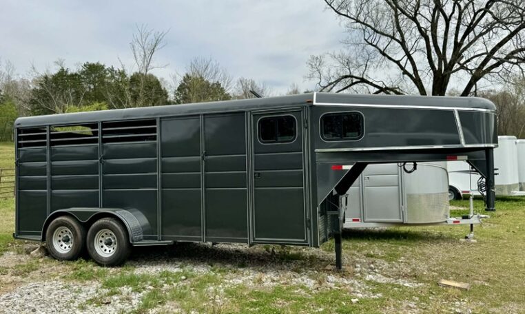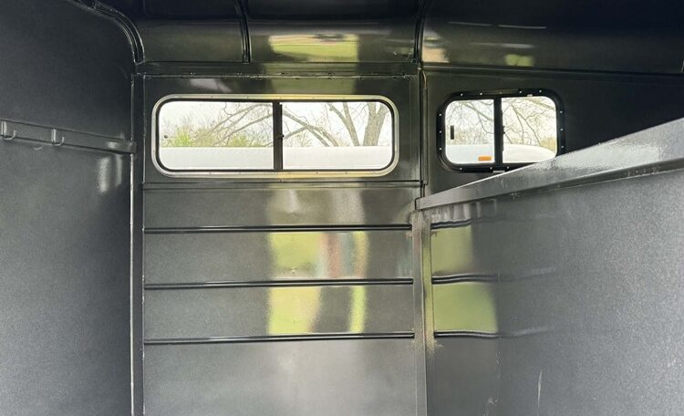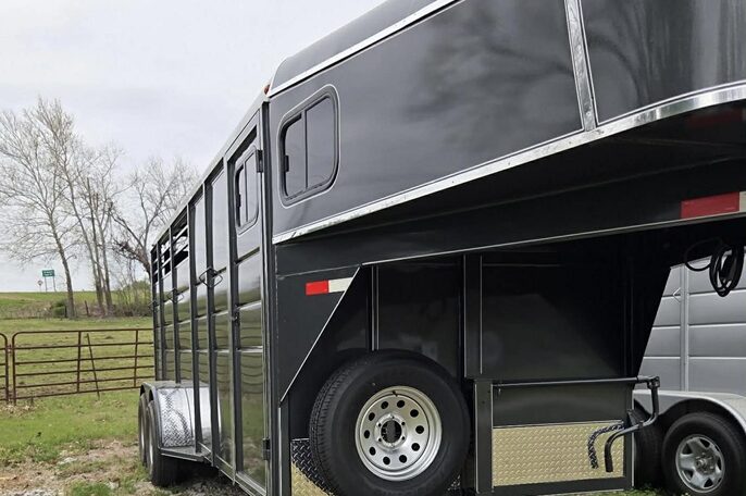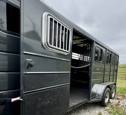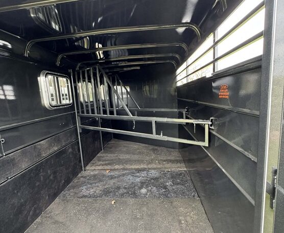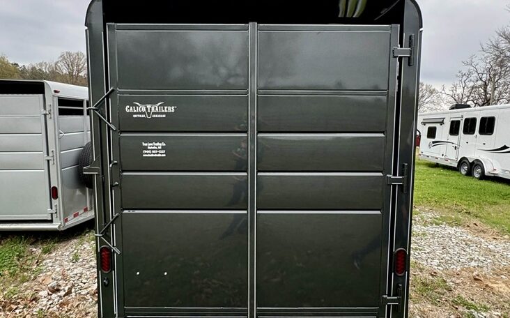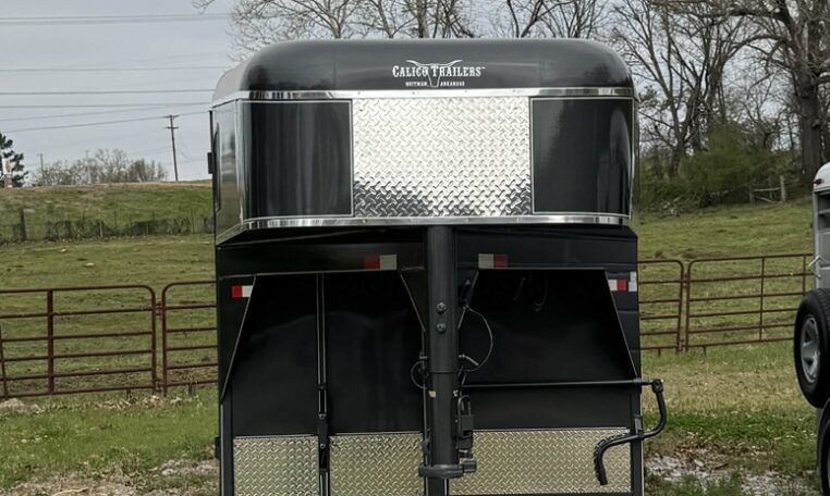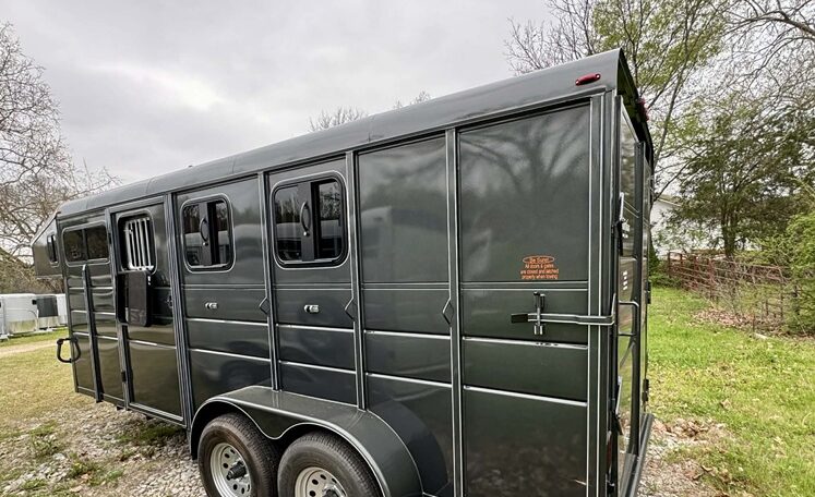 New Calico 3 horse slant load gooseneck, 18′ long x 6’8″ wide x 7′ tall, 4′ short wall, solid wall dressing room, dome lights, drop-down windows head side, 3 saddle racks, 16-inch 10-ply radial tires, torflex axles, window in dressing room door, brakes on both axles. Includes rubber package — mats on floor, rubber on walls, and spare tire. Dressing room has frame/braced for A/C in ceiling.