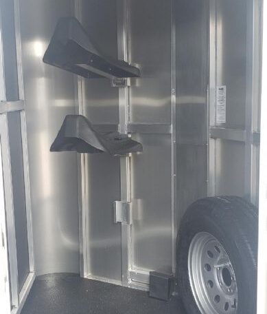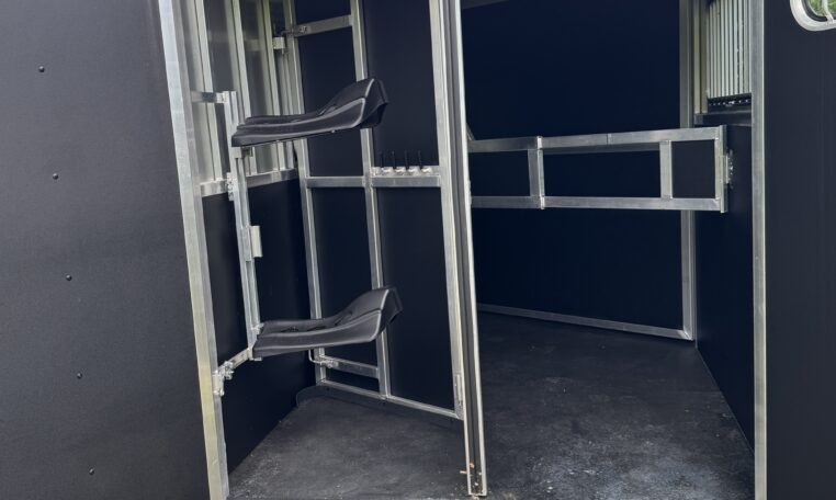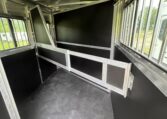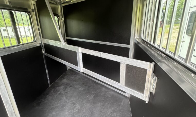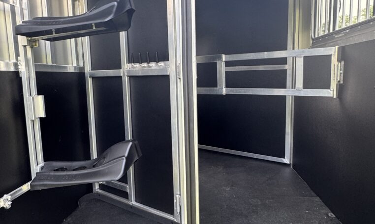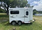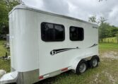 On the lot! Shadow 2 horse slant load bumper pull, 13’6 x 6’4 x 7’6, 3500# spring leaf axles, 15″ tires, spare. Dressing room: 24″ short wall, 28″ dressing room door w 14 x 24 window, swinging slant wall, 2 saddle racks (can be put in the back or the front), bridle hooks, dome light. Horse area: 24 x 32 drop feed windows streetside, 19 x 53 drop feed window curbside, lined lower walls, aluminum stall divider w/ rumber inserts, dome light, 50/50 rear doors with window in load door, rear tack with folding tack wall, swing-out saddle racks, bridle hooks, graphics, 42″ stall width, drop feed window curbside and rear door, dome lights, pressure treated wood floor with rubber mats, hinged rear door, exterior load light, 2 fans, exterior ties.