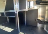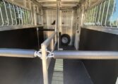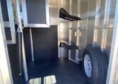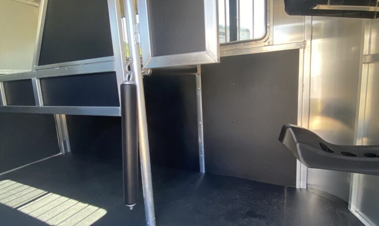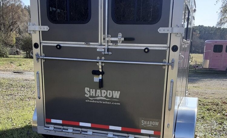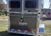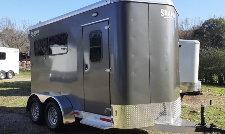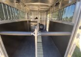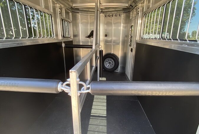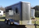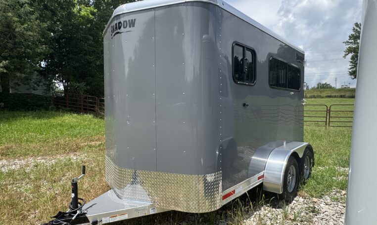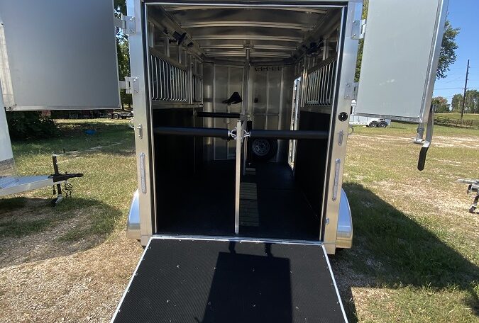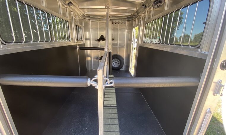 Get an all aluminum trailer for under $17,000! This is a brand new straight-load Stablemate, has saddle racks in the front but no dressing room wall. Trailer measures 12.6 x 7.6 x 6.9, 3500 lb axles, drop-down windows streetside, 32″ access door curbside, 2 saddle racks in front nose, 19 x 64 slider windows at hip area, rear ramp/dutch doors, dome lights, rumber lined walls, pressure treated wood floor with mats, fans.